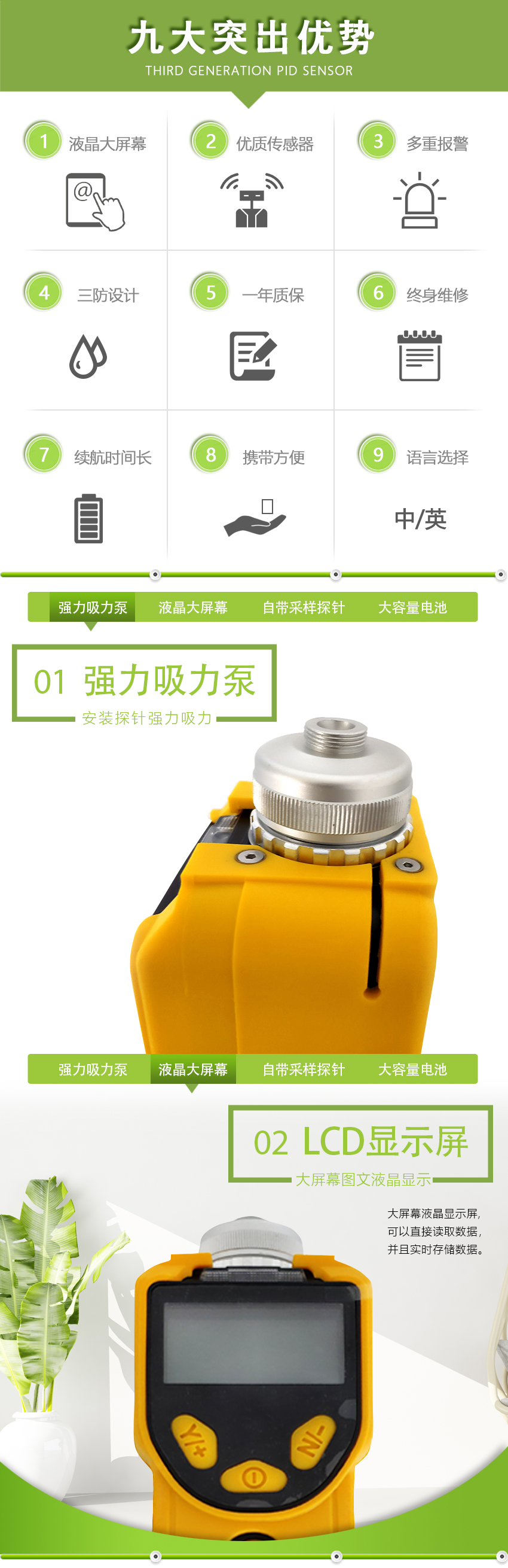 1、第三代PID傳感器,響應(yīng)時(shí)間短,檢測(cè)范圍寬
