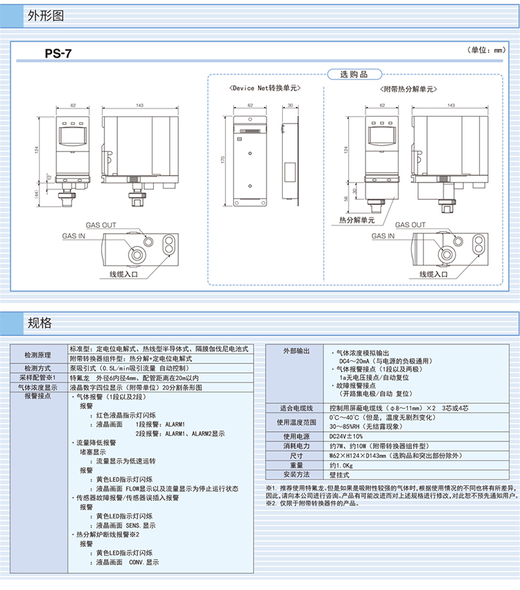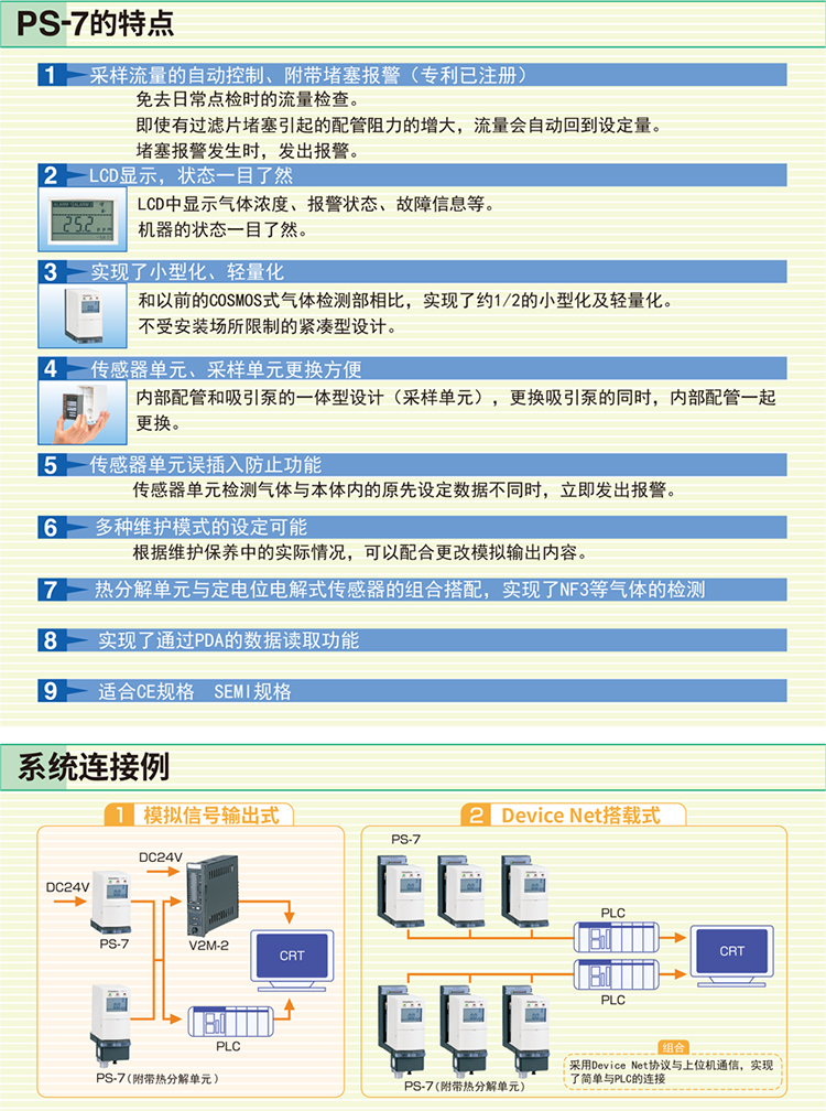 PS-7是一款通過更換傳感器單元可以檢測多種氣體,可通過PDA讀取數(shù)據(jù)。通過更換傳感器就可以檢測多種氣體的半導(dǎo)體材料氣體檢測器;傳感器經(jīng)過校準和交付,無需現(xiàn)場氣體校準。此外,無需工具即可輕松更換傳感器;小巧輕便的設(shè)計;通過LCD顯示屏輕松了解氣體濃度,報警狀態(tài)和錯誤信息;采樣流量的自動控制功能;當(dāng)插入與設(shè)置不同的傳感器時,傳感器具有防止錯誤插入的功能;通過連接PDA,可以獲取存儲在檢測單元中的數(shù)據(jù);轉(zhuǎn)換器單元(選件)可用于檢測NF3和CCl2;符合CE標準;符合SEMI標準。產(chǎn)品用于石油化工、半導(dǎo)體制造等。