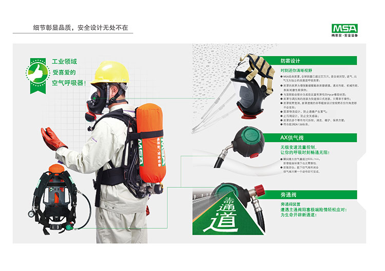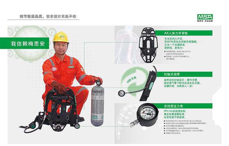 梅思安AX2100自給開路式壓縮空氣呼吸器 作為MSA推出的新一代空氣呼吸器,在延續前一代空氣呼吸器安全性能的前提下,巧妙結合中國人體工程學設計,程度提升佩戴舒適性以及使用靈活性。通過升級供氣閥,增大供氣流量;增加旁通功能,提供多一倍的安全防護;更換背板,提高背負貼合度;拉鏈式肩帶,方便互換操作等諸多改進,更進一步提高用戶體驗??蓮V泛用于石油、化工、冶金、電力、船舶、運輸、礦業、醫療等諸多行業和領域。