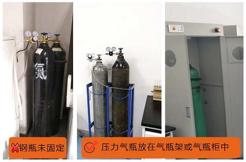 2、實(shí)驗(yàn)室氣體鋼瓶沒有固定,且未滿足鋼瓶存放點(diǎn)的基本條件。如通風(fēng)、遠(yuǎn)離熱源、避免暴曬、地面平整干燥等。