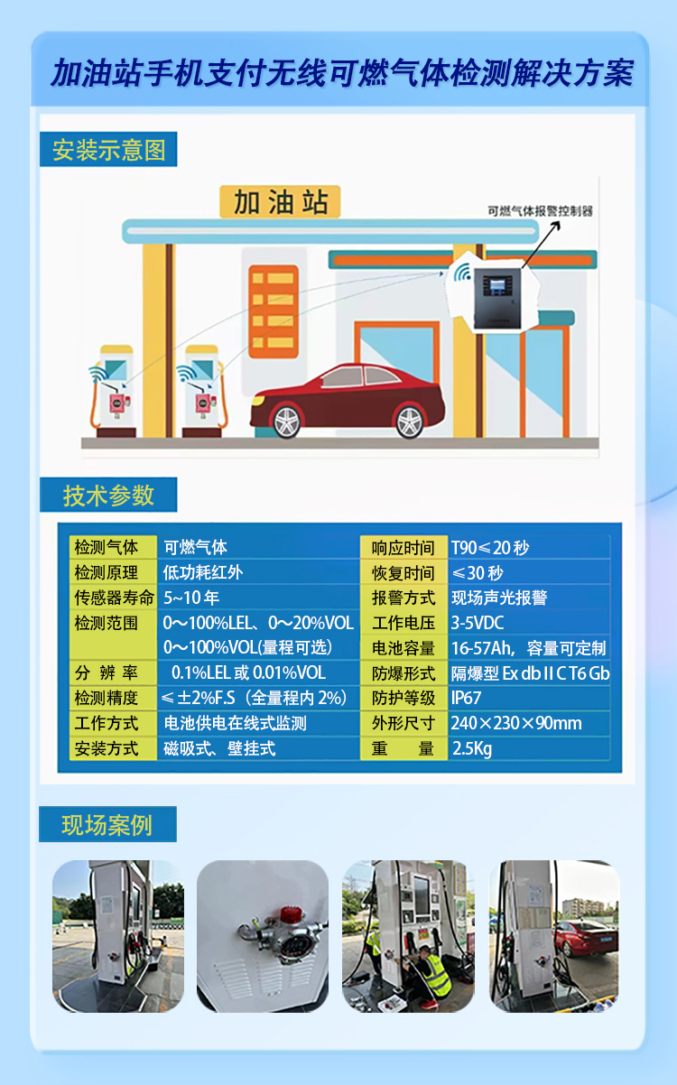 經估算正常車主進站內支付時間約為3-5分鐘,加油作業(yè)區(qū)手機支付時間約為30秒至1分鐘。手機支付的使用會提升加油站服務效率,減少客戶擁堵、等待時間,提高油品銷量,增強加油車主的加油體驗,增加提高了客戶粘性。另外加油進行時部分車主及乘客會在車內打電話、看視頻等,這些無意識操作可能會給加油站帶來潛在風險。為加強加油站現(xiàn)場油氣安全風險管控、提高支付效率,促進油品銷量,滿足AQ3010標準,需要在各加油站作業(yè)現(xiàn)場安裝可燃氣體報警設備。