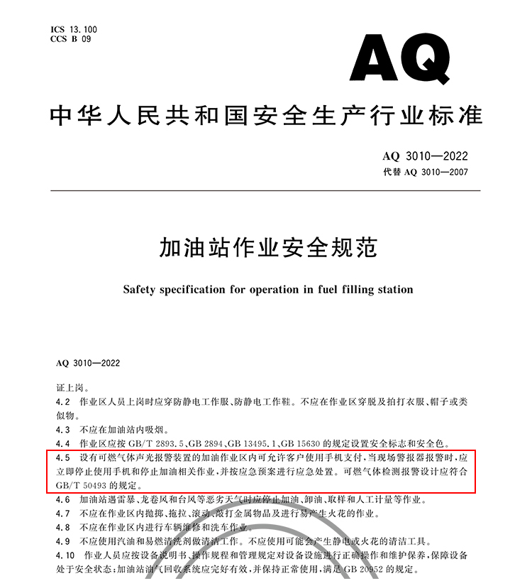 根據(jù)應急管理部日前批準發(fā)布的AQ 3010-2022《加油站作業(yè)安全規(guī)范》,考慮到加油站特殊場所,為加強油氣安全風險管控,在標準4.5條中寫到:設有可燃氣體聲光報警裝置的加油作業(yè)區(qū)內可允許客戶使用手機支付,當現(xiàn)場報警器報警時,應立即停止使用手機和停止加油相關作業(yè),并按應急預案進行應急處置??扇細怏w檢測報警設計應符合GB/ T50493的規(guī)定。此新規(guī)于2023年4月1日起正式實施。