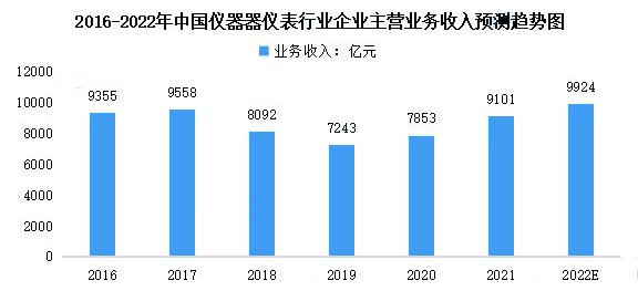 目前,我國(guó)儀器儀表行業(yè)的產(chǎn)品門類、品種比較齊全,布局較為合理,且已具備可觀的技術(shù)基礎(chǔ)和生產(chǎn)規(guī)模。數(shù)據(jù)顯示,我國(guó)儀器儀表行業(yè)企業(yè)主營(yíng)業(yè)務(wù)收入在2016年-2017年小幅增長(zhǎng)后下降至2019年的7243億元,在2019-2021年呈增長(zhǎng)趨勢(shì)。隨著節(jié)能降耗、民生產(chǎn)業(yè)、戰(zhàn)略性新興產(chǎn)業(yè)的持續(xù)發(fā)展以及國(guó)家對(duì)食品安全和環(huán)境保護(hù)的重視程度加大,為我國(guó)儀器儀表行業(yè)帶來(lái)了新的機(jī)遇。中商產(chǎn)業(yè)研究院預(yù)測(cè),2022年我國(guó)儀器儀表行業(yè)企業(yè)主營(yíng)業(yè)務(wù)收入將達(dá)9924億元。