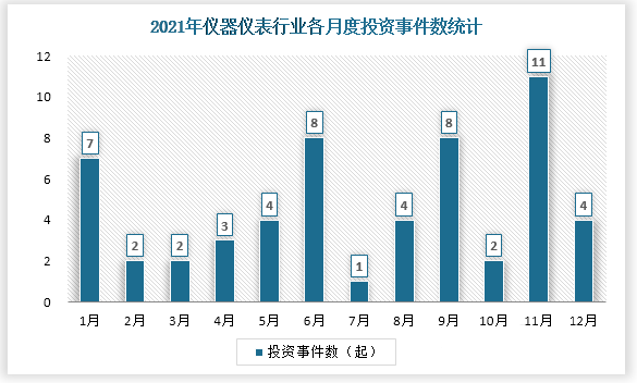 2021年我國(guó)儀器儀表行業(yè)共發(fā)生投資19起,投資金額最高的為8月,當(dāng)月發(fā)生投資事件2起,已披露投資金額達(dá)16.6億元。