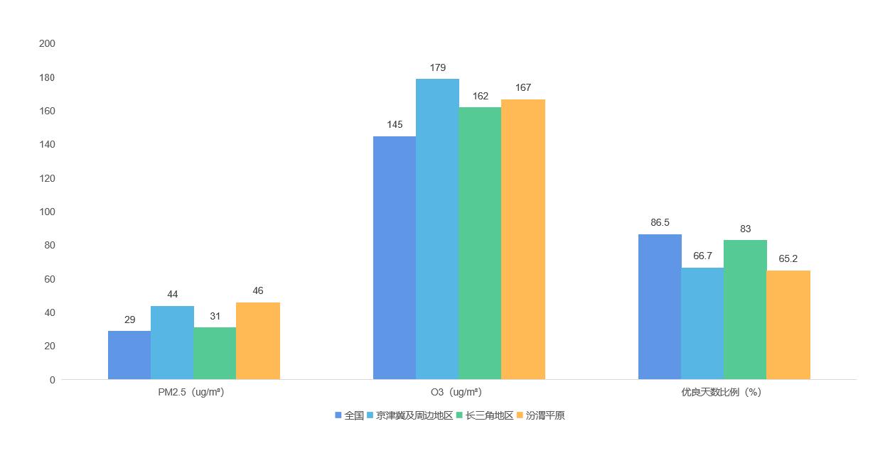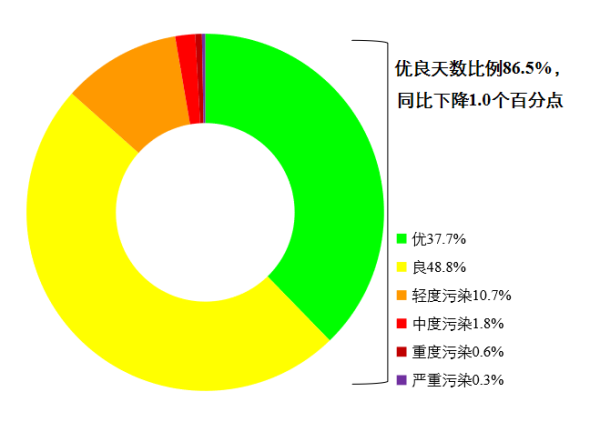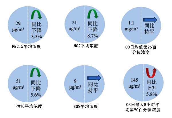 1—12月,全國339個地級及以上城市平均空氣質(zhì)量優(yōu)良天數(shù)比例為86.5%,同比下降1.0個百分點;PM2.5平均濃度為29微克/立方米,同比下降3.3%;PM10平均濃度為51微克/立方米,同比下降5.6%;O3平均濃度為145微克/立方米,同比上升5.8%;SO2平均濃度為9微克/立方米,同比持平;NO2平均濃度為21微克/立方米,同比下降8.7%;CO平均濃度為1.1毫克/立方米,同比持平。