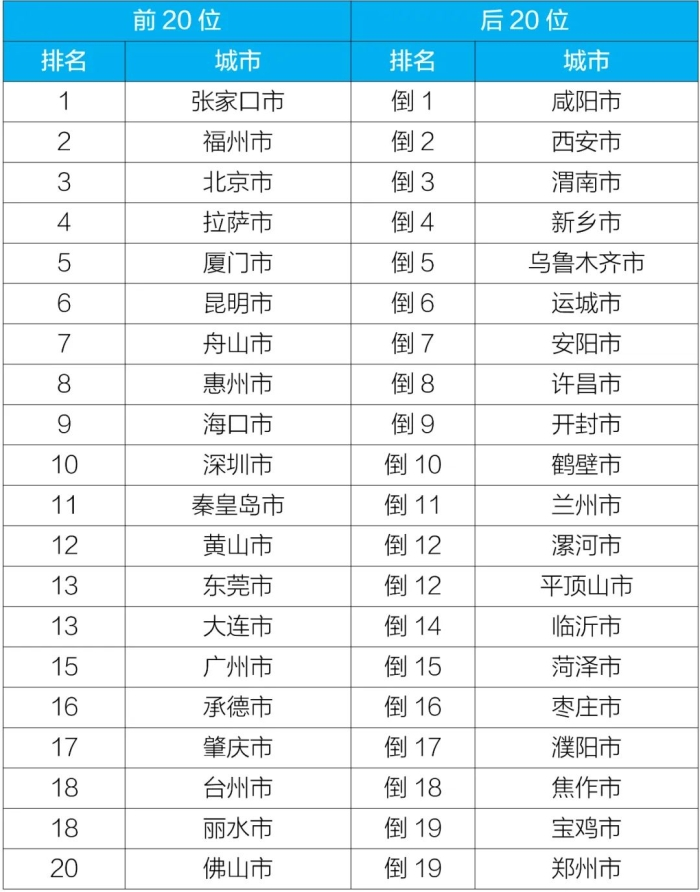 12月,168個重點城市中,張家口、福州和北京市等城市空氣質(zhì)量相對較好(從第1名至第20名);咸陽、西安和渭南市等城市空氣質(zhì)量相對較差(從倒數(shù)第1名至并列倒數(shù)第19名),見附表1。