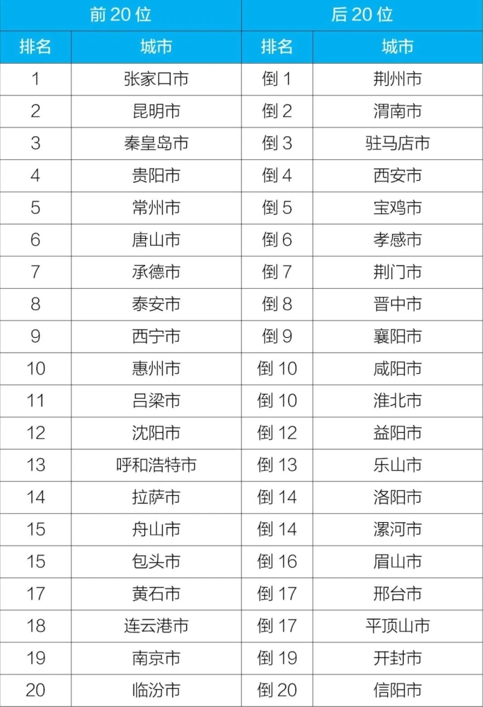 2022年12月168個重點城市空氣質(zhì)量排名前20位和后20位城市名單