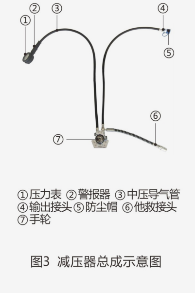 減壓器總成(圖3)是將氣瓶內(nèi)高壓氣體減壓后,輸出0.8MPa左右的中壓氣體,經(jīng)中壓導(dǎo)氣管送至供氣閥供使用人員呼吸的裝置。減壓器可在-40℃~+80℃溫度內(nèi)正常工作。減壓器總成由減壓器、手輪、壓力表、警報(bào)器、中壓導(dǎo)氣管、輸出接頭和他救接頭組成。
