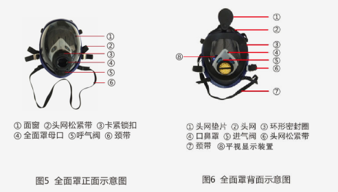 全面罩總成(圖5、圖6)是用來罩住臉部,隔絕有毒有害氣體,阻止其進(jìn)入人體呼吸系統(tǒng)的裝置。面罩總成主要由大視野面窗、口鼻罩、呼氣閥、面罩母口、壓力平視顯示裝置和頭網(wǎng)組件組成。面窗內(nèi)的口鼻罩可完全罩住佩戴者的口部和鼻子,能有效提高空氣的利用率。頭網(wǎng)組件主要采用芳綸材料、薄型網(wǎng)狀結(jié)構(gòu),左右兩側(cè)均配有扣環(huán)式松緊帶,柔韌性好,可以自由調(diào)節(jié)佩戴的松緊程度,增加佩戴的便捷性和舒適度。