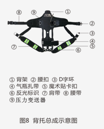 背托總成(圖8)是用來支承氣瓶總成和減壓器總成的裝置。背托總成主要由高強(qiáng)度塑料背架、左肩帶、右肩帶、腰帶和氣瓶扎帶組成。主體背架采用人體工程學(xué)設(shè)計(jì),從而保持整套裝具與人體良好佩戴,既協(xié)調(diào)又舒適。背架上附有氣壓變送器,主要功能是通過壓力傳感器測量呼吸器氣瓶的氣壓,并且轉(zhuǎn)變成標(biāo)準(zhǔn)的電信號(hào),再通過無線通信將氣壓信息傳送至全面罩中的壓力平視裝置。背架和背帶均具有阻燃、防水、防靜電功能,并耐沖擊、耐酸腐蝕,使用溫度在-40℃~+140℃以上。氣瓶扎帶上附有卡扣,用以快速鎖緊氣瓶;腰帶上配有腰帶扣,用以實(shí)現(xiàn)腰帶的扣緊與分離、腰帶松緊的調(diào)節(jié)。