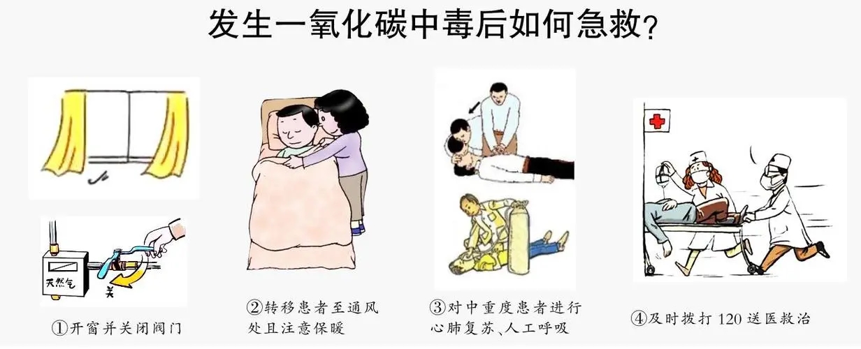 1.首先立即開窗通風(fēng),使空氣對流,迅速關(guān)閉煤氣/燃?xì)庠罹摺崴鏖y門、管道煤氣、熄滅炭火等設(shè)施設(shè)備。