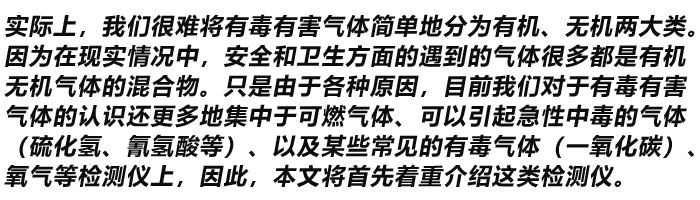 2、根據(jù)危害,我們將有毒有害氣體分為可燃?xì)怏w和有毒氣體兩大類。由于它們性質(zhì)和危害不同,其檢測(cè)手段也有所不同。
