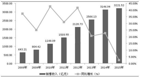 從行業(yè)銷售收入來看,2015年,環(huán)保設(shè)備行業(yè)銷售收入達(dá)到了3221.52億元,相比上年增長2.37%。從2008年到2015年,環(huán)保設(shè)備行業(yè)銷售收入從643.21億元增長到3221.52億元,年均增長率達(dá)到了25.88%。