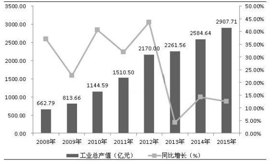 圖表1:2008-2015年環(huán)保設(shè)備行業(yè)產(chǎn)值變化情況(單位:億元,%)